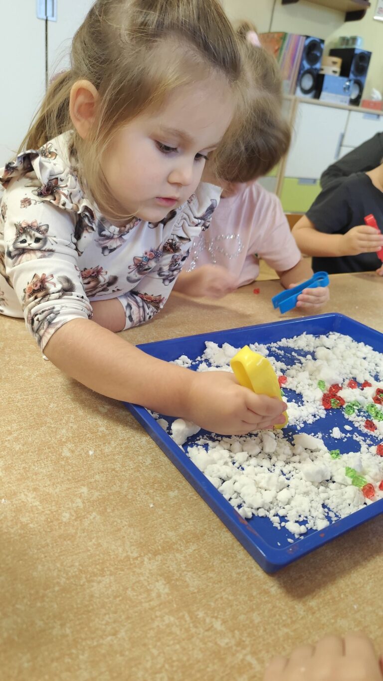 W grudniu odbyły się kolejne zajęcia w grupie Pszczółki z innowacji pedagogicznej “Polisensoryczne zabawy dla przedszkolaków” z użyciem własnoręcznie wykonanego sztucznego śniegu ze składników spożywczych