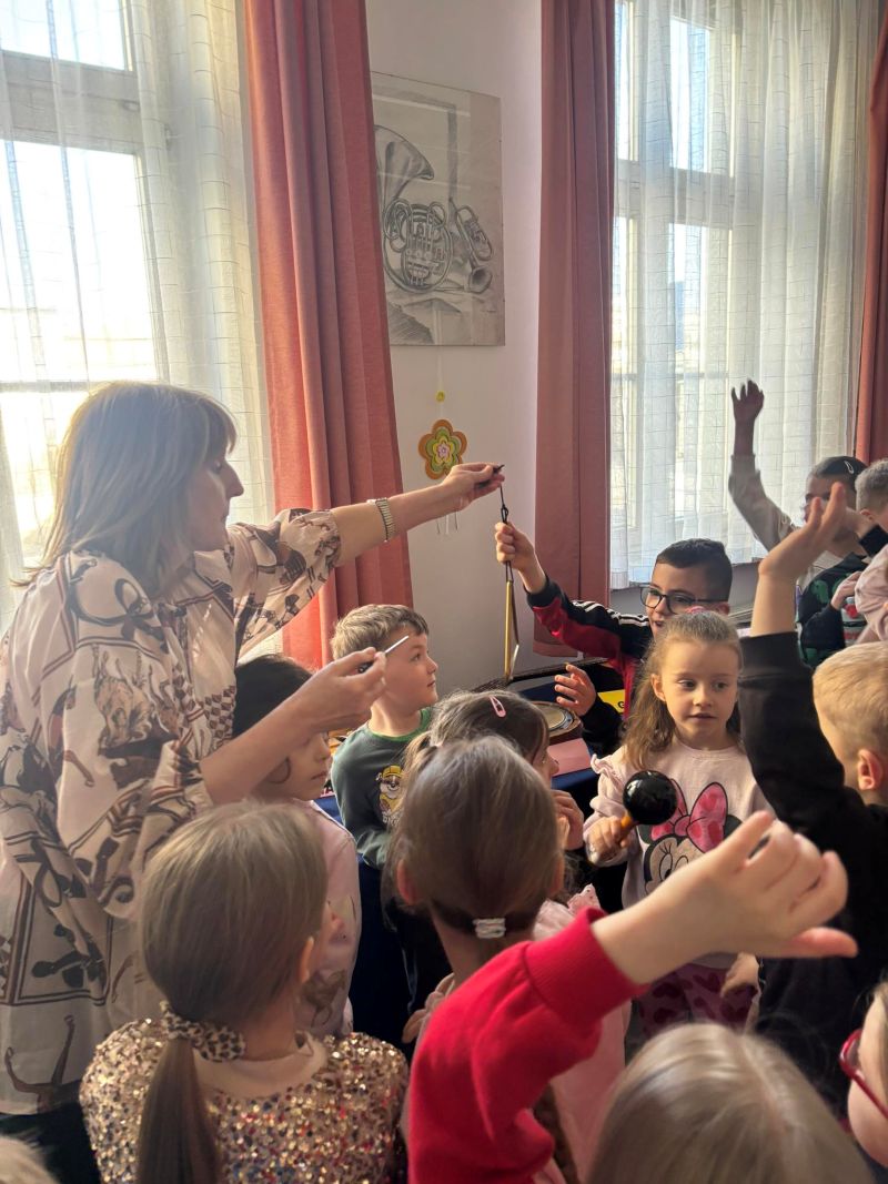 Po koncercie przyszedł czas na równie fascynującą część wizyty – oglądanie wystawy instrumentów muzycznych. Przedszkolaki mogły z bliska przyjrzeć się różnorodnym instrumentom, poznać ich nazwy oraz dowiedzieć się, jak powstaje dźwięk. Dla wielu dzieci była to pierwsza okazja, by zobaczyć taką kolekcję i odkryć, jak różnorodny jest świat muzyki.