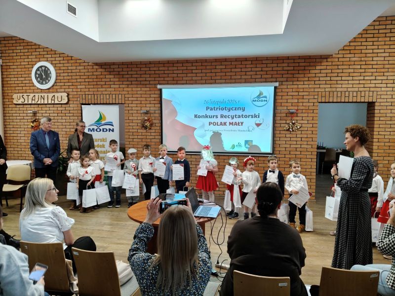 26 listopada 2025r. w Ełckim Centrum Rewitalizacji Społecznej “STAJNIA” odbył się Patriotyczny konkurs recytatorski “Polak Mały” organizowany przez Mazurski Ośrodek Doskonalenia Nauczycieli pod patronatem Prezydenta Miasta Ełku.