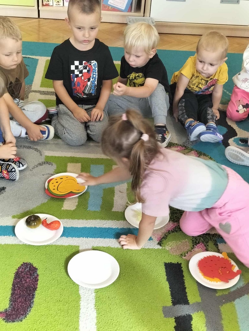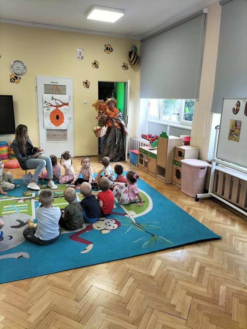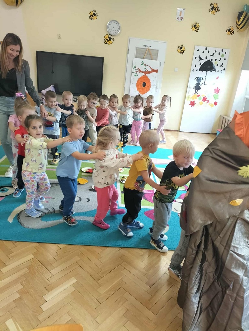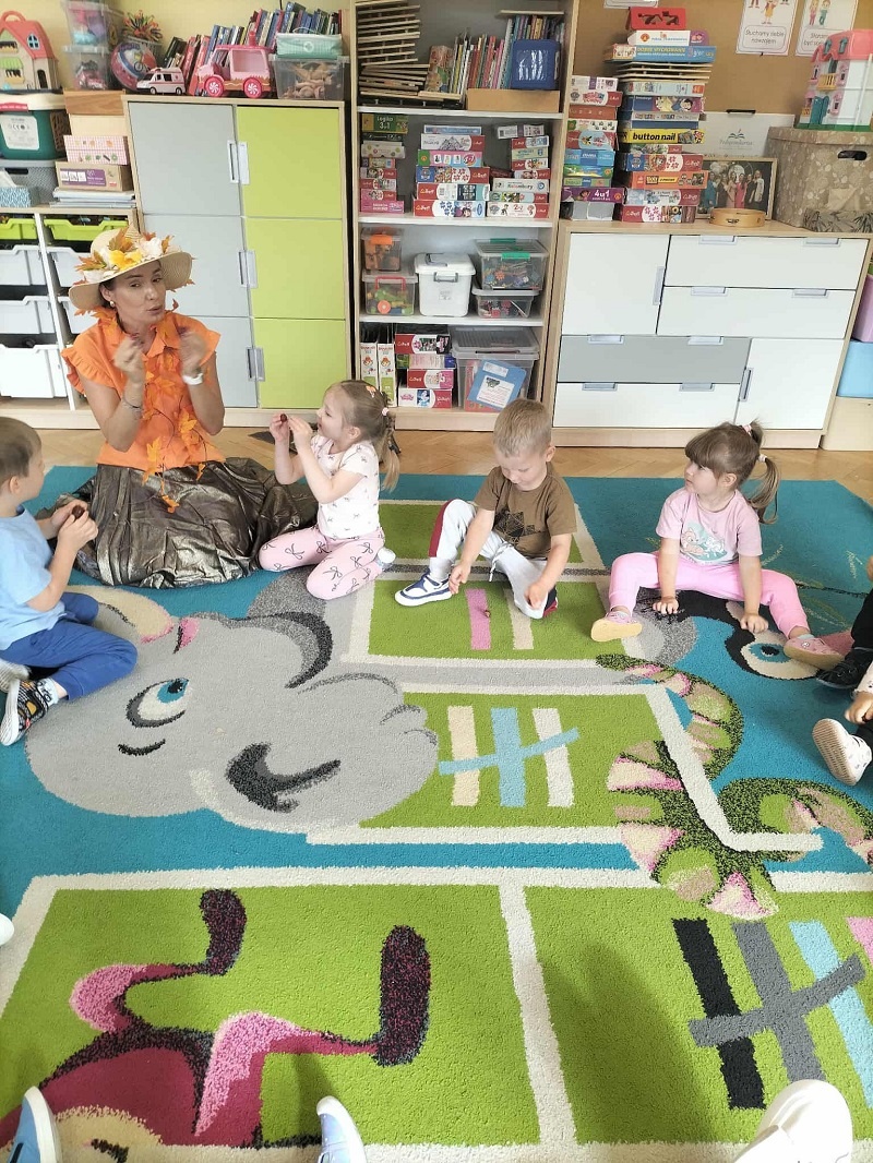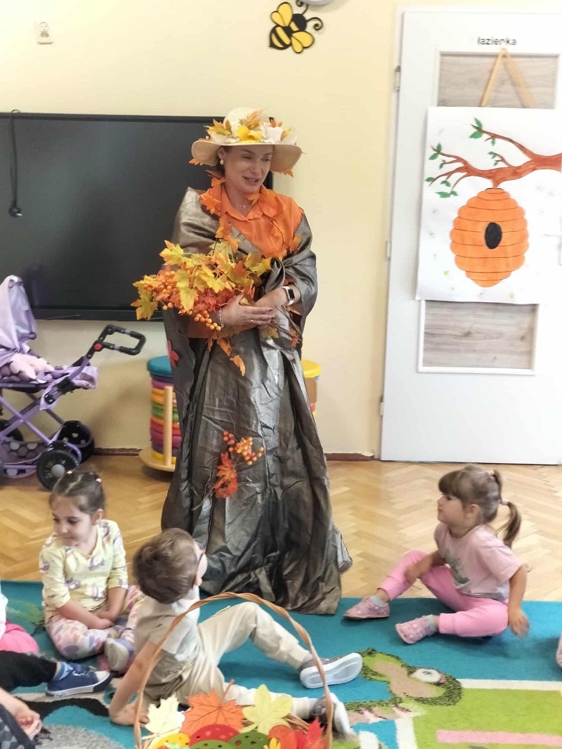 , kasztany  i szyszki. Najmłodsi przedszkolacy zaskoczeni tym spotkaniem z ogromnym zaangażowaniem segregowały wręczone im przez Panią Jesień dary, klasyfikowały liście, utrwalając nazwy kolorów, uczestniczyły w zabawie rytmicznej z wykorzystaniem kasztanów, wysłuchały listu od Pani Jesieni skierowanego do dzieci, a na zakończenie bawiły się w tańcu z Panią Jesienią. Dzieci poprosiły także Jesień o to, aby do nich jeszcze przyjechała w odwiedziny…z pewnością Jesień jeszcze wielokrotnie o sobie dzieciom przypomni, a sami przedszkolacy spotkają się „z nią” na spacerze, w parku czy lesie…