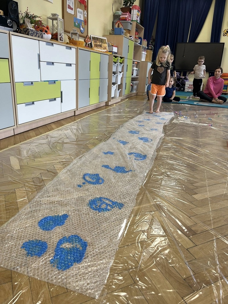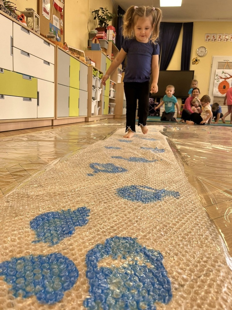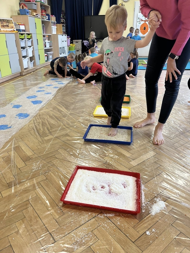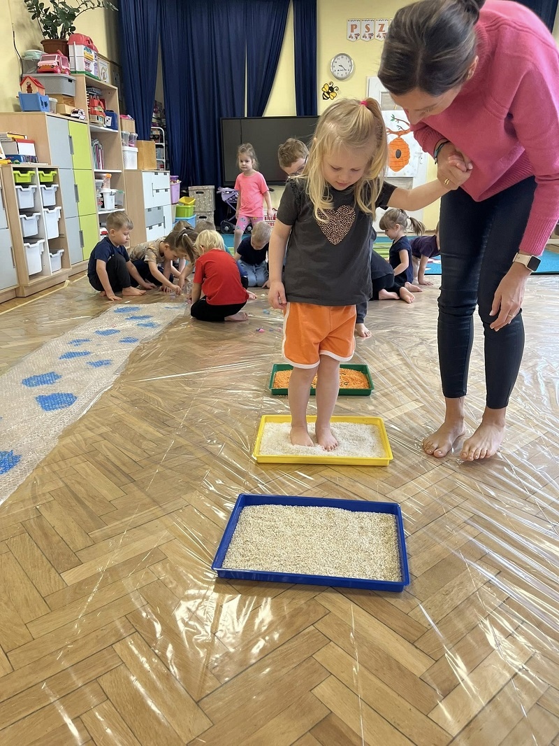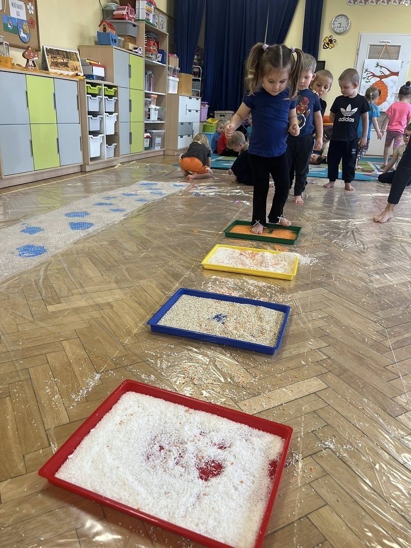 W listopadzie w grupie „Pszczółki” odbyły się kolejne zajęcia z cyklu sensoplastyki w ramach realizacji innowacji pedagogicznej „Polisensoryczne zabawy dla przedszkolaków”. Dzisiejsze zajęcia skupiały się na sensorycznych doznaniach związanych z doświadczaniem różnych faktur produktów sypkich i folii bąbelkowej(chodzenie po ścieżce sensorycznej), malowania farbami deszczowej pogody, spryskiwanie folii rozcieńczoną farbą z wodą – wywoływanie deszczu z chmury. Poza sensorycznymi aspektami, dzieci doskonaliły motorykę małą, ćwicząc napięcie mięśni dłoni i palców oraz ich precyzję w wykonywanych ruchach dłoni. Umiejętności te pełnią niezwykle ważną rolę przy nauce trzymania i posługiwania się narzędziem piśmiennym, a więc umiejętnością motoryki małej. Poza edukacyjnymi celami, zajęcia niosły radość dzieciom ze wspólnej zabawy i doświadczania nowych bodźców sensorycznych. Takie namacalne doświadczanie otoczenia zachęca maluchy do poznawania, odkrywania i rozwoju. Dziecko w ten sposób poznaje nie tylko siebie, ale również zjawiska zachodzące wokół.