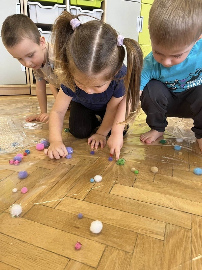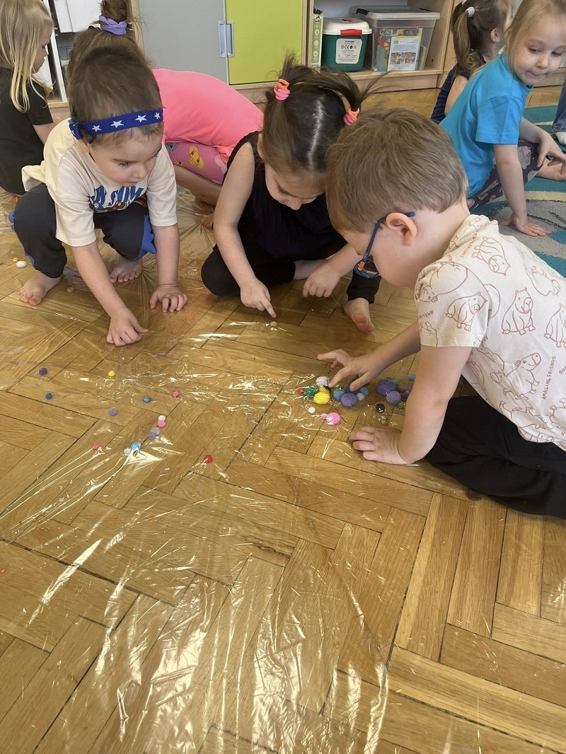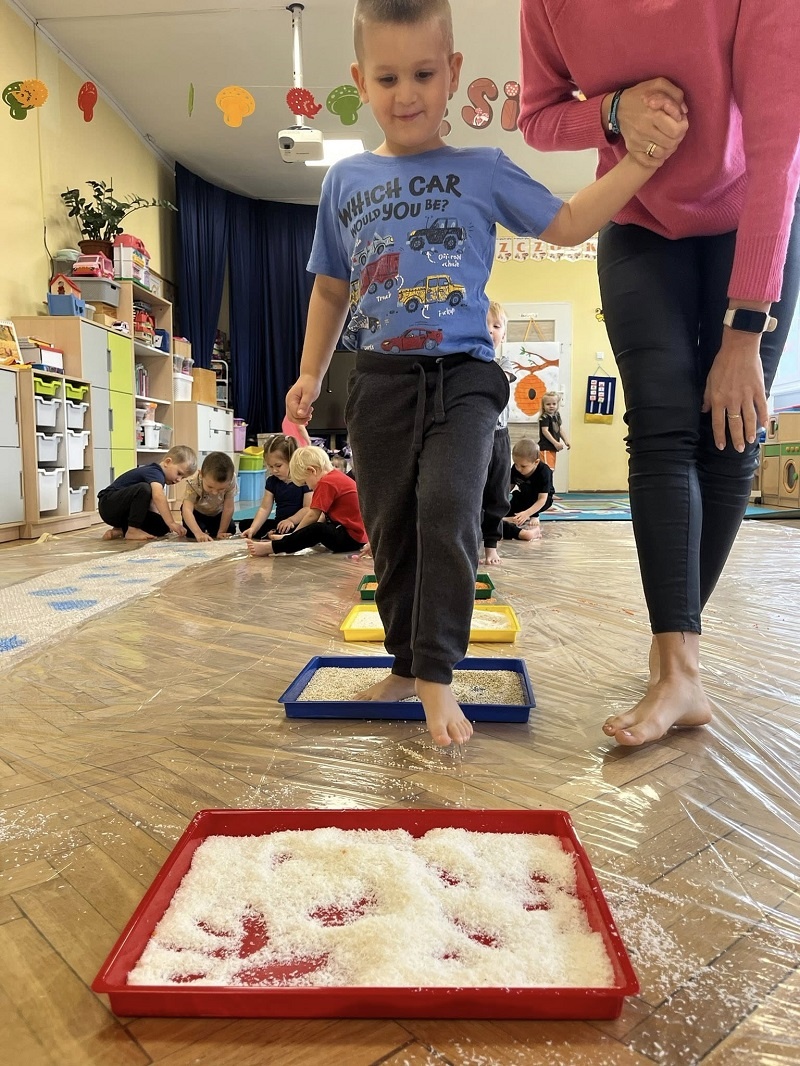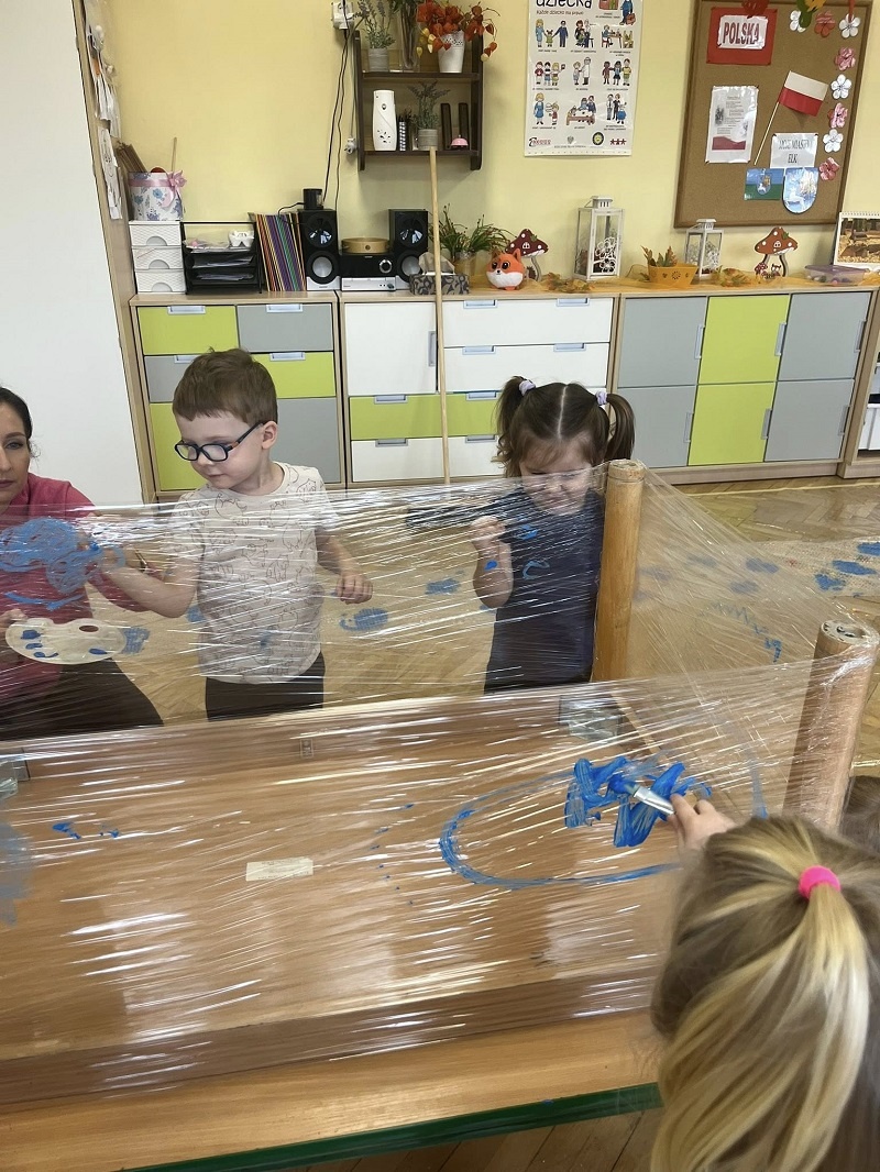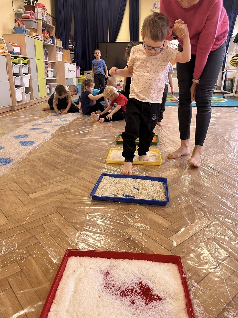 W listopadzie w grupie „Pszczółki” odbyły się kolejne zajęcia z cyklu sensoplastyki w ramach realizacji innowacji pedagogicznej „Polisensoryczne zabawy dla przedszkolaków”. Dzisiejsze zajęcia skupiały się na sensorycznych doznaniach związanych z doświadczaniem różnych faktur produktów sypkich i folii bąbelkowej(chodzenie po ścieżce sensorycznej), malowania farbami deszczowej pogody, spryskiwanie folii rozcieńczoną farbą z wodą – wywoływanie deszczu z chmury. Poza sensorycznymi aspektami, dzieci doskonaliły motorykę małą, ćwicząc napięcie mięśni dłoni i palców oraz ich precyzję w wykonywanych ruchach dłoni. Umiejętności te pełnią niezwykle ważną rolę przy nauce trzymania i posługiwania się narzędziem piśmiennym, a więc umiejętnością motoryki małej. Poza edukacyjnymi celami, zajęcia niosły radość dzieciom ze wspólnej zabawy i doświadczania nowych bodźców sensorycznych. Takie namacalne doświadczanie otoczenia zachęca maluchy do poznawania, odkrywania i rozwoju. Dziecko w ten sposób poznaje nie tylko siebie, ale również zjawiska zachodzące wokół.