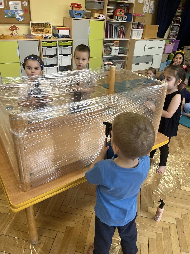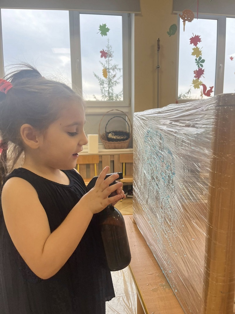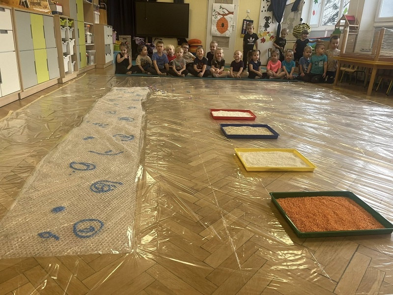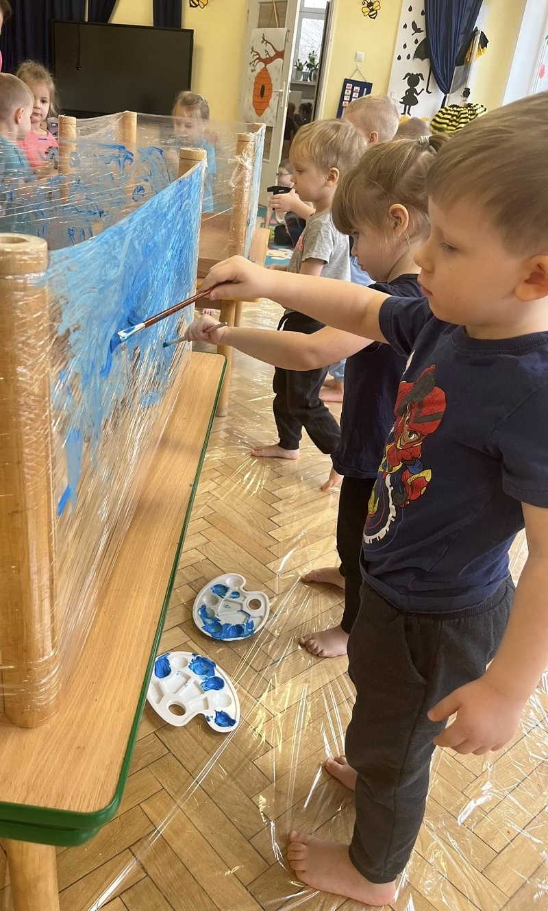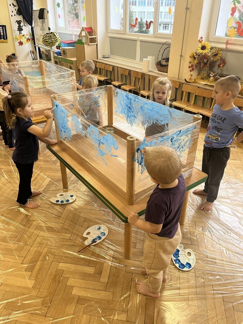 W listopadzie w grupie „Pszczółki” odbyły się kolejne zajęcia z cyklu sensoplastyki w ramach realizacji innowacji pedagogicznej „Polisensoryczne zabawy dla przedszkolaków”. Dzisiejsze zajęcia skupiały się na sensorycznych doznaniach związanych z doświadczaniem różnych faktur produktów sypkich i folii bąbelkowej(chodzenie po ścieżce sensorycznej), malowania farbami deszczowej pogody, spryskiwanie folii rozcieńczoną farbą z wodą – wywoływanie deszczu z chmury. Poza sensorycznymi aspektami, dzieci doskonaliły motorykę małą, ćwicząc napięcie mięśni dłoni i palców oraz ich precyzję w wykonywanych ruchach dłoni. Umiejętności te pełnią niezwykle ważną rolę przy nauce trzymania i posługiwania się narzędziem piśmiennym, a więc umiejętnością motoryki małej. Poza edukacyjnymi celami, zajęcia niosły radość dzieciom ze wspólnej zabawy i doświadczania nowych bodźców sensorycznych. Takie namacalne doświadczanie otoczenia zachęca maluchy do poznawania, odkrywania i rozwoju. Dziecko w ten sposób poznaje nie tylko siebie, ale również zjawiska zachodzące wokół.