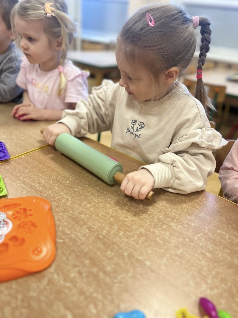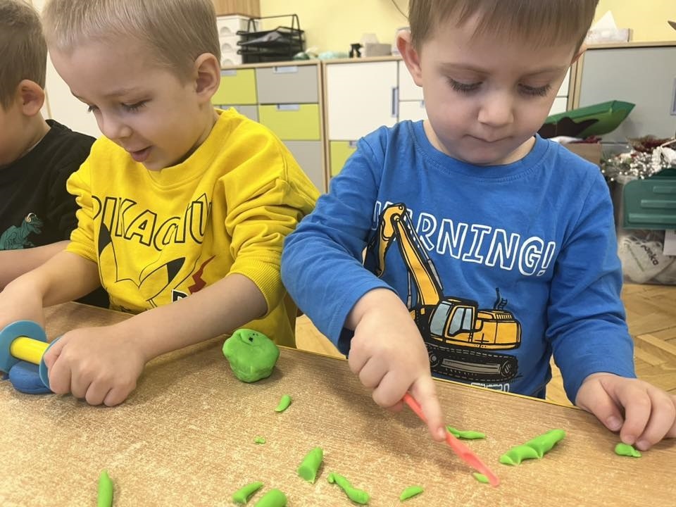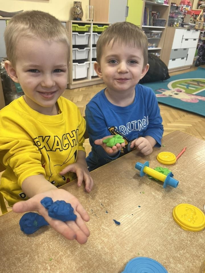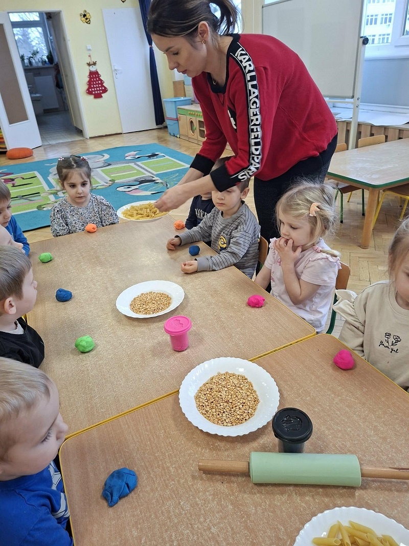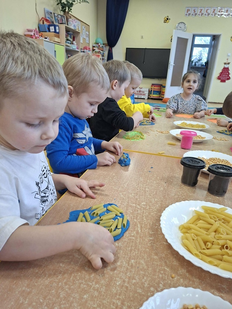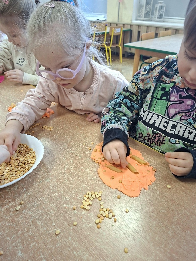 26 stycznie 2026 r. w „Pszczółkach” odbyły się kolejne zajęcia w ramach innowacji pedagogicznej z sensoplastyki. Tym razem do pracy twórczej wykorzystaliśmy ciastolinę oraz foremki i narzędzia do tej aktywności. Było ugniatanie, wałkowanie, krojenie, wyciskanie, które wzmacniały możliwości motoryczne naszych maluszków. Dzieci na zakończenie pracy tworzyły własne „obrazy” twórcze z wykorzystaniem produktów sypkich takich jak groch i makaron. Ileż w tych pracach było zaangażowania i chęci wyrażenie własnej ekspresji…