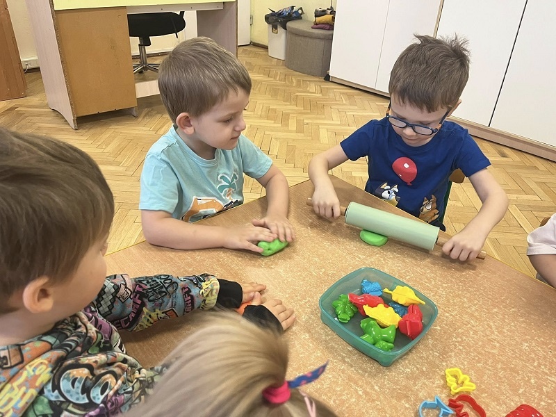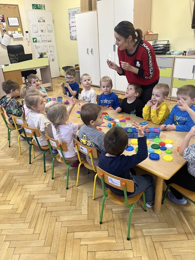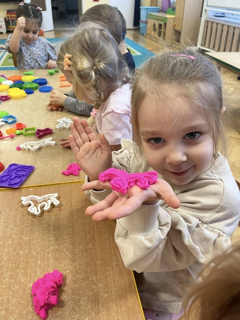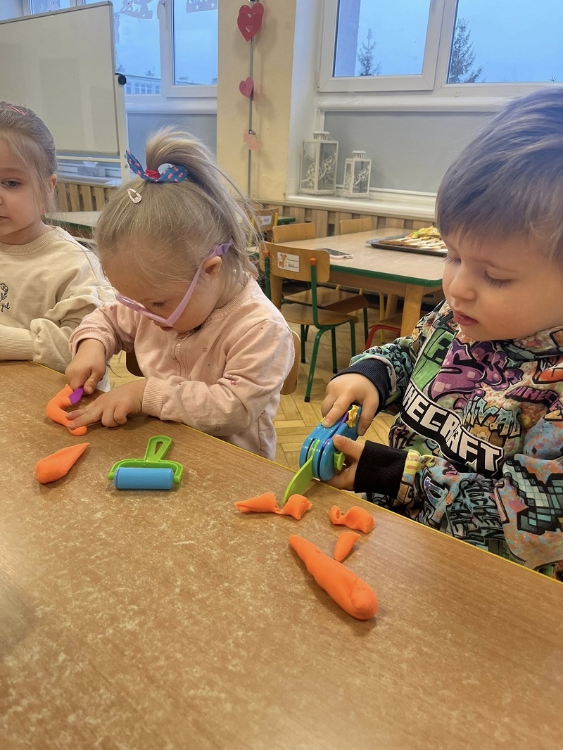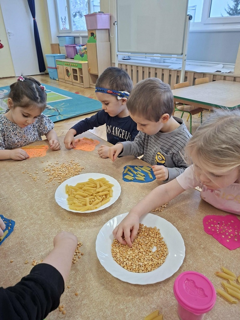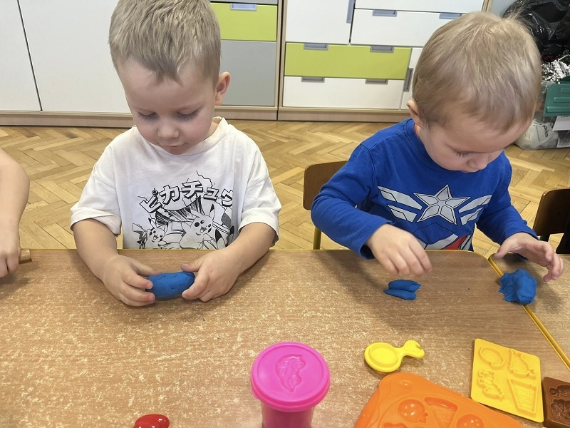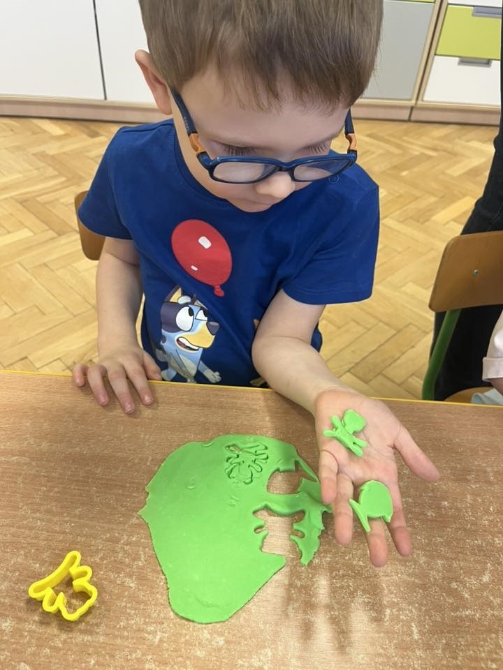 26 stycznie 2026 r. w „Pszczółkach” odbyły się kolejne zajęcia w ramach innowacji pedagogicznej z sensoplastyki. Tym razem do pracy twórczej wykorzystaliśmy ciastolinę oraz foremki i narzędzia do tej aktywności. Było ugniatanie, wałkowanie, krojenie, wyciskanie, które wzmacniały możliwości motoryczne naszych maluszków. Dzieci na zakończenie pracy tworzyły własne „obrazy” twórcze z wykorzystaniem produktów sypkich takich jak groch i makaron. Ileż w tych pracach było zaangażowania i chęci wyrażenie własnej ekspresji…