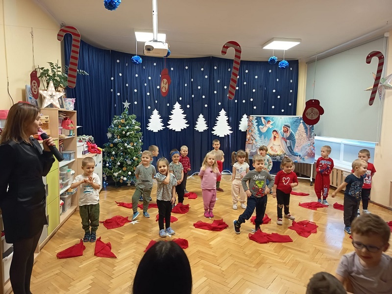 9 grudnia 2025 r. odbyły się świąteczne warsztaty z rodzicami w grupie „Pszczółki” odbyły się dzisiaj pod znakiem krótkiego występu artystycznego dedykowanego rodzicom – w tym tańca z chustkami tiulowymi, śpiewania piosenki o świętym Mikołaju oraz prezentacji świątecznego wiersza, a ponadto zabaw z rodzicami w tym z gumą sensoryczną do znanej kolędy, zabaw plastycznych z wykorzystaniem m.in. metody edukacji przez ruch wg Doroty Dziamskiej, tworząc piękne kolorowe, odrysowane z szablonów bombki ze wspólnie narysowanych w rytm słuchanej muzyki kolorowych kół, wykonania rodzinnej kreatywnej drewnianej bombki, zabawy kołowej o świętym Mikołaju z wykorzystaniem muzyki poważnej wg metody aktywnego słuchania muzyki Batti Strauss. Całe spotkanie zwieńczył wspólny, nastrojowy taniec z lampionami do kolędy „Lulajże Jezuniu”. Było to piękne spotkanie, które zbliżyło nas bardziej do siebie i jako rodziców, ale też nauczycieli i dzieci. Ten piękny, przedświąteczny czas niech będzie dla każdego z nas okresem nie tylko przygotowań, ale też okazji do bycia razem i przeżywania pięknego, radosnego czasu oczekiwania na nadejście Jezusa.