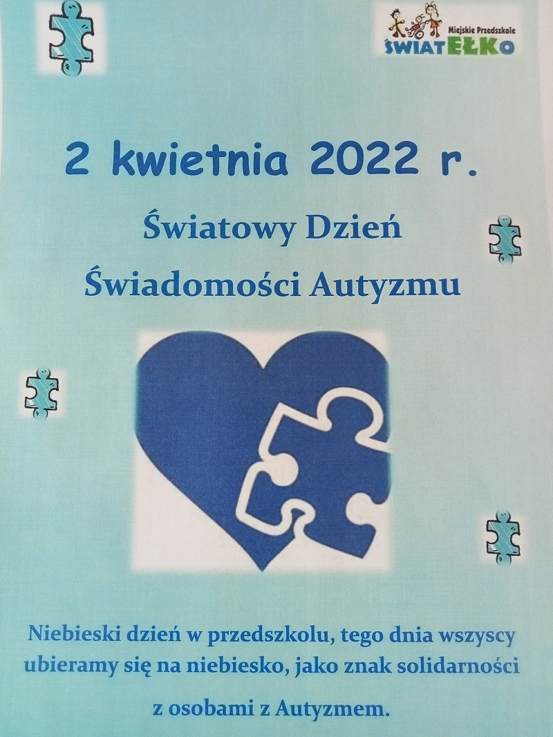 01.04.2022r. obchodzimy go w naszym przedszkolu. Solidaryzujemy się tym samym z osobami z autyzmem i ich rodzinami. Dzisiejszego dnia towarzyszył nam kolor niebieski, który jest symbolem autyzmu.