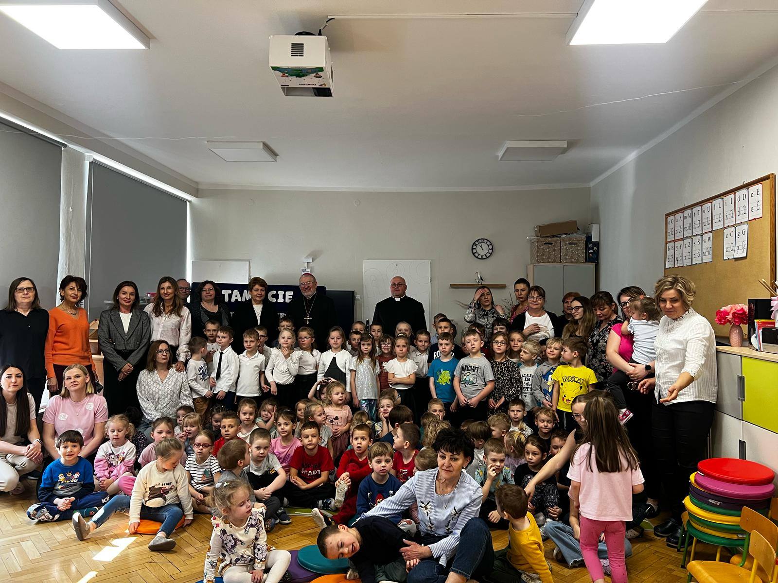 11 marca 2025r. w naszym przedszkolu gościliśmy wyjątkowego gościa Jego Ekscelencję ks. Bp.Jerzego Mazura oraz Proboszcza Parafii Św. Jana Apostoła i Ewangelisty ks. Krzysztofa Karskiego oraz ks.Marka. Grupa Pszczółki przygotowała piękny występ i życzenia. Na zakończenie spotkania ks. Bp.pomodlił się wspólnie z dziećmi i udzielił duszpasterskiego błogosławieństwa . Na pożegnanie wszystkie dzieci otrzymały pamiątkowe obrazki.